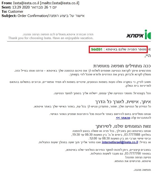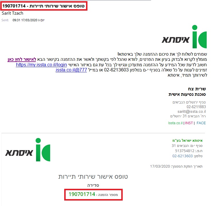 מספר פניה הינו בעל 6 ספרות. ניתן למצוא את מספר האישור במייל (ראה דוגמא מטה)